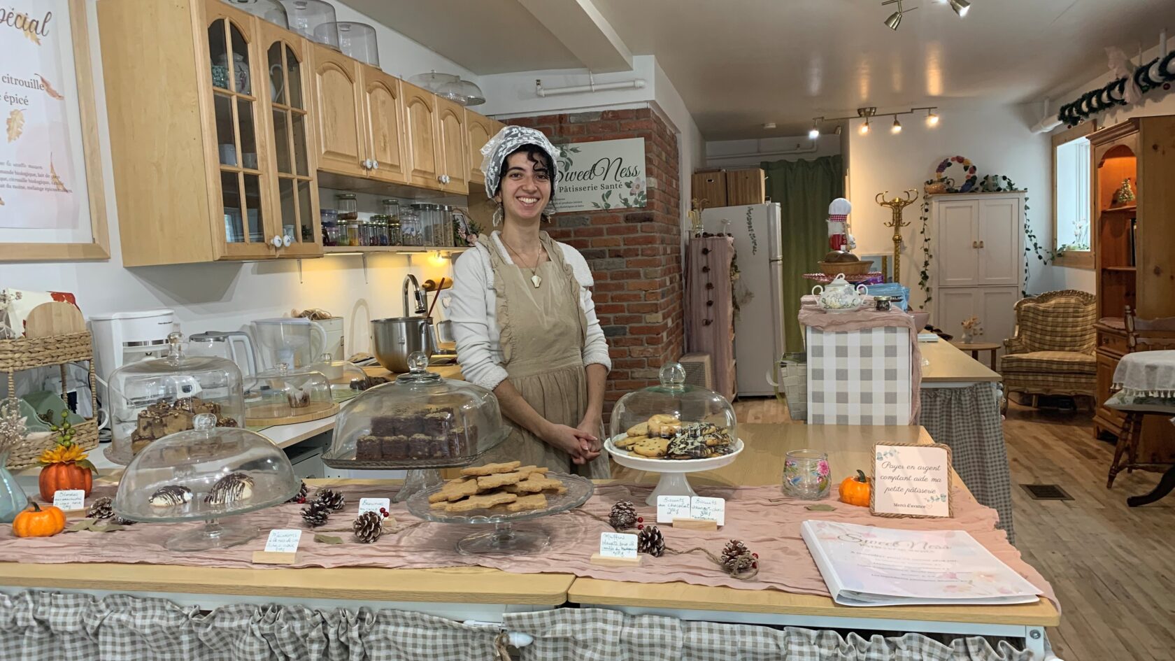 Deux autres points suscitent l’étonnement et complètent le cachet unique de SweetNess. Le premier concerne la maîtresse des lieux, qui est vêtue à l’ancienne et porte même un adorable bonnet de dentelle. Le second, c’est que l’on peut voir la cheffe à l’ouvrage, puisque sa cuisine est ouverte sur le reste de la boutique. « Pour Noël, j’ai fait des biscuits au pain d’épice, avec de la farine d’amande comme tous mes autres produits. Je les prépare avec mon propre mélange d’épices maison, donc c’est ma version de biscuits de Noël santé. » Elle prévoit également de faire des bûches de Noël. À déguster sans modération… ou presque.
